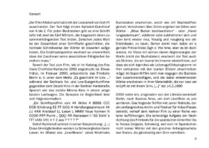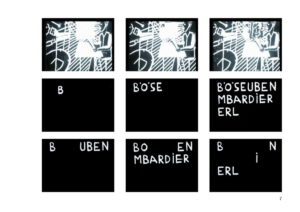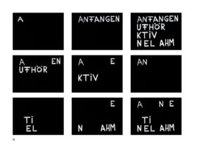 „Der Film Alfabet setzt sich mit der Lesbarkeit von Schrift auseinander. Der Text folgt einem Alphabet-Durchlauf von A bis Z. Für jeden Buchstaben gibt es eine Schrifttafel mit zwei bis fünf Wörtern, die insgesamt einen zusammenhängenden Text bilden. Zwischen jedes Wort ist der Gesamttext einer Schrifttafel geschnitten, die normale Schreibweise der Wörter ist bisweilen aufgehoben. Die Erzählperspektive wechselt so unvermittelt, dass der Zuschauer seine assoziativen Fähigkeiten bemühen muss.“ Soweit der Text zum Film, wie er im Katalog des Festivals CineVideo Karlsruhe 1991 abgedruckt ist.