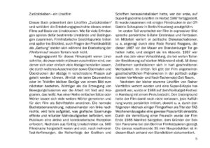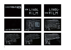 Dieses Buch präsentiert den Linolfilm „Zurückbleiben“ und schildert die Entstehungsgeschichte des ersten Films auf Basis von Linoldrucken. Ausgangspunkt für dieses Filmprojekt waren Linolschnitte, die zwar relativ mühsam zu schnitzen sind, von denen sich aber einfach viele Abzüge herstellen lassen, die durch weiteres Ausschneiden sowie Übermalen und Überdrucken der Abzüge in verschiedene Phasen aufgeteilt werden können. Wichtiger als die Erzeugung von Bewegungsillusionen war die Arbeit mit Text und Anagramm, das heißt: Aus einer Reihe einfacher Sätze oder Wörter lassen sich viele weitere Wörter generieren und für den Film als Schrifttafeln anordnen.